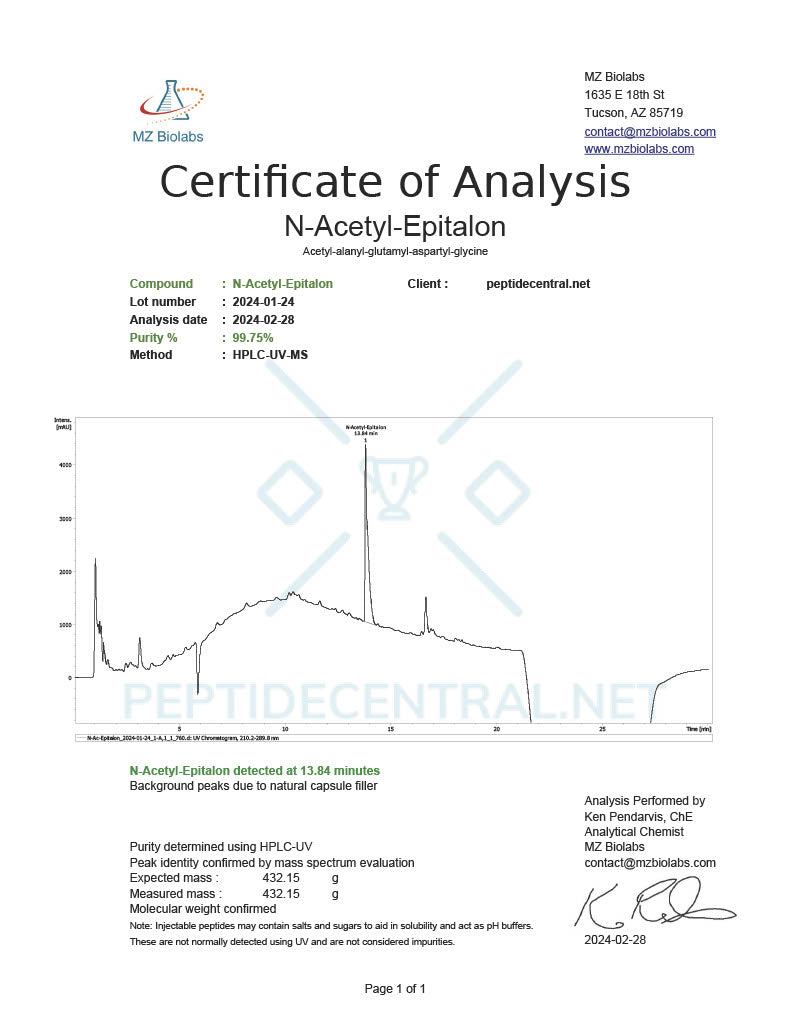 Epithalon (also known as Epitalon or Epithalone) is the synthetic version of the polypeptide Epithalamin, which is naturally produced in the pineal gland.